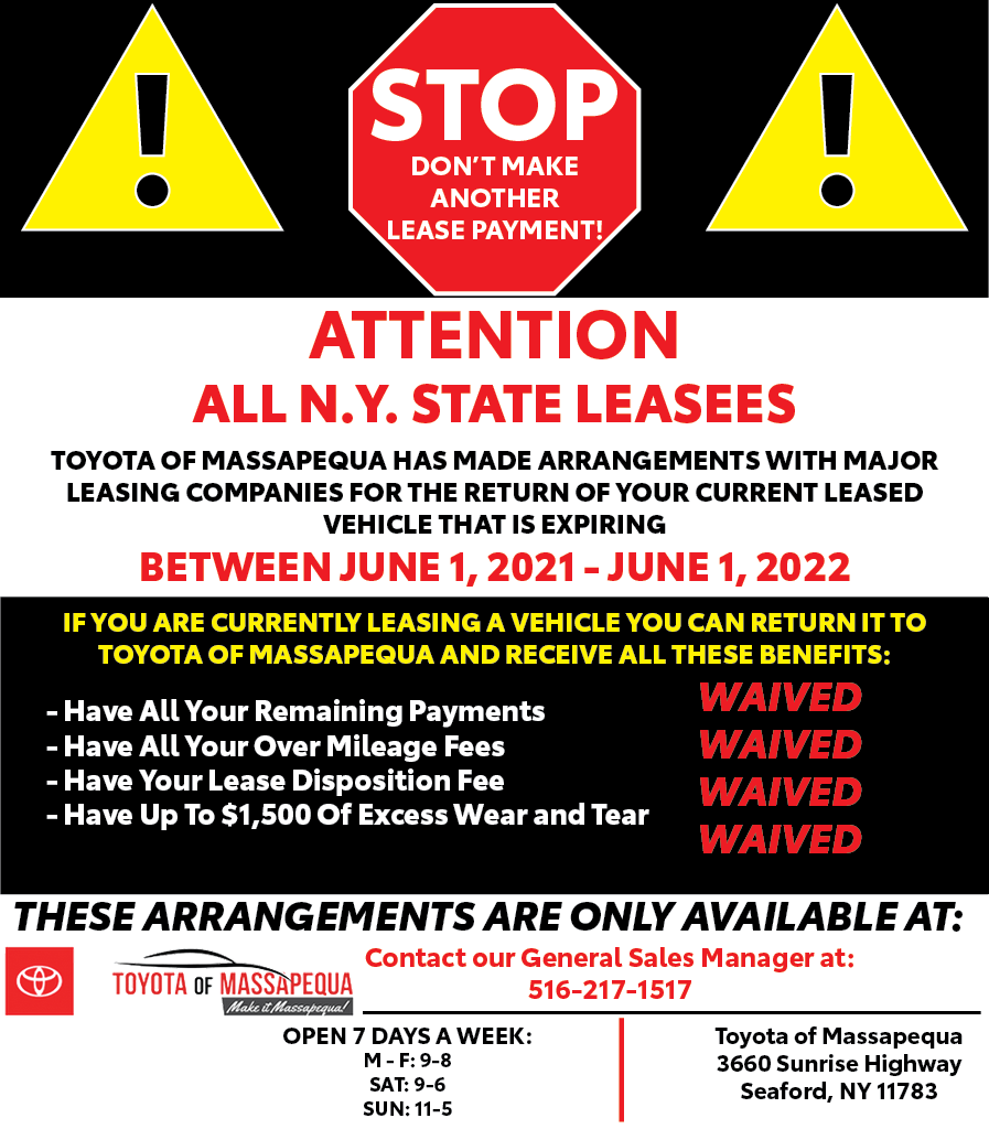 Your business is important to us and we compete vigorously for it with millennium toyota, toyota of massapequa, advantage toyota, atlantic toyota, and sunrise toyota.